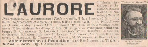 - *La rédaction du journal L’Aurore, 142 rue Montmartre (au 4ème étage), Paris
